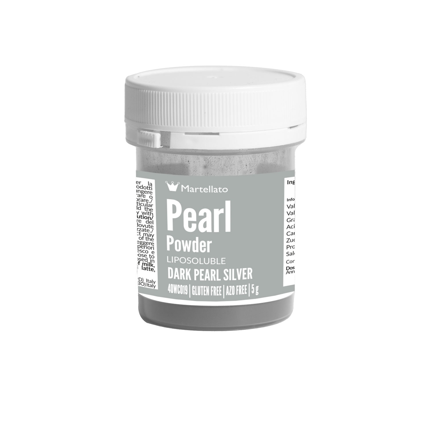 Dunkles Silberpulver mit Perleffekt, geeignet für die Oberflächenfärbung von Produkten auf Fettbasis wie weiße Schokolade, Buttercreme, Mandelpaste, Zuckerpaste, Parfaits. Es kann pur mit einem Pinsel aufgetragen werden oder mit flüssigem Schellack verdünnt und direkt auf die zu dekorierende Oberfläche gestrichen werden.