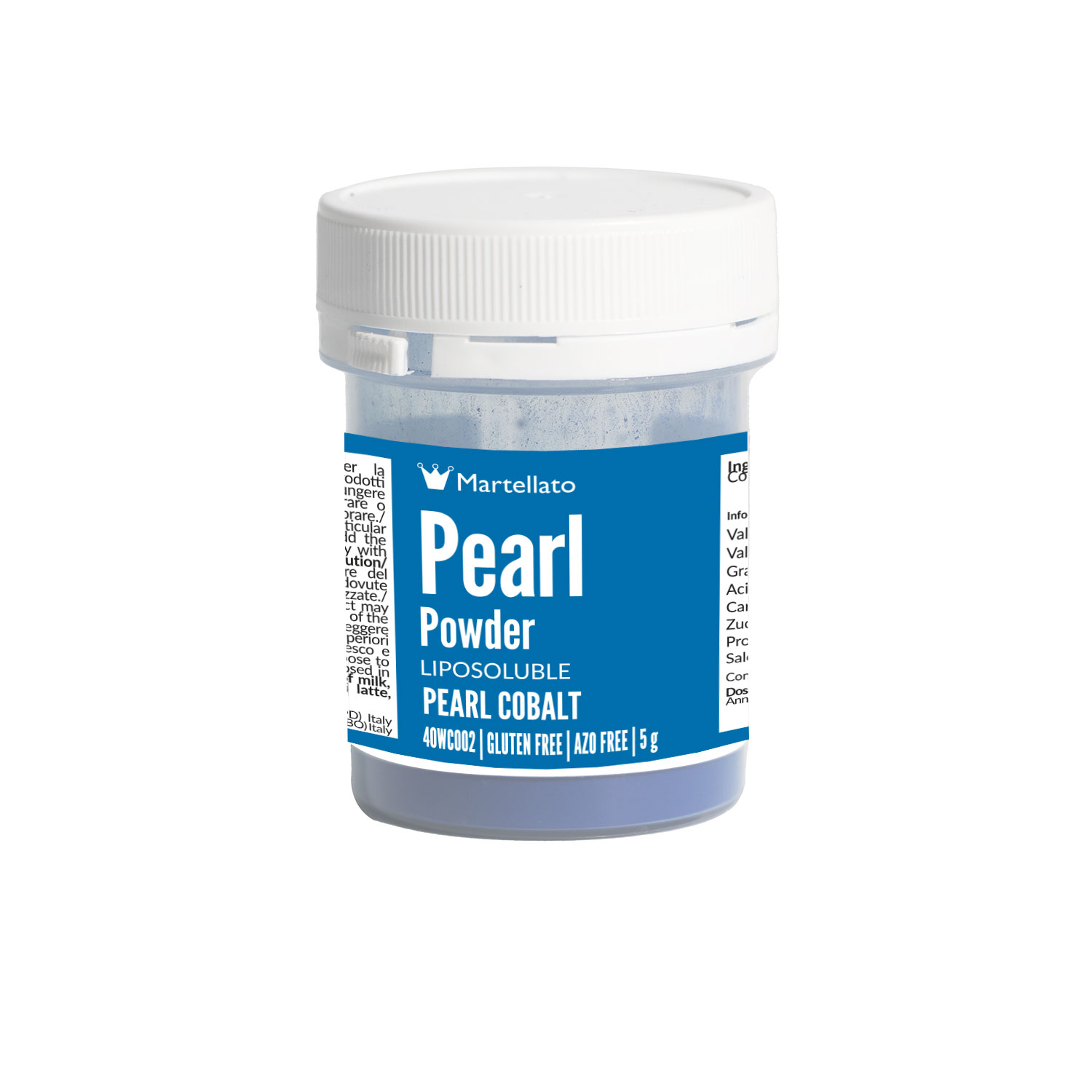 Pulverförmiger Kobalt-Perleffekt-Farbstoff, geeignet für die Oberflächenfärbung von Produkten auf Fettbasis wie weiße Schokolade, Buttercreme, Mandelpaste, Zuckerpaste, Parfaits. Es kann pur mit einem Pinsel verwendet werden oder mit flüssigem Schellack verdünnt und dann direkt auf die zu dekorierende Oberfläche gestrichen werden.