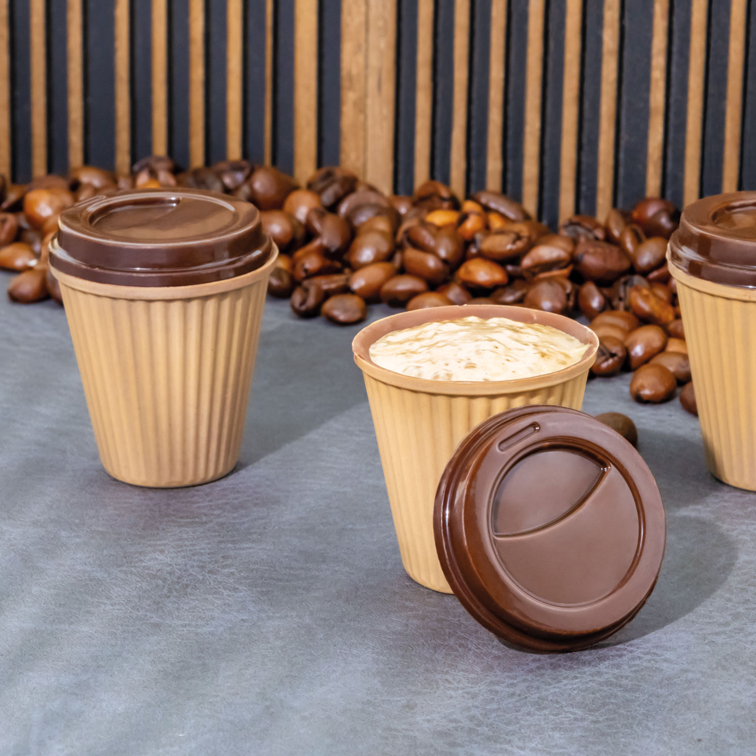 | Becher: Artikelgröße: ø 35 x h 35 mm Gewicht: ~ 8 gr Formenlayout: 6 x 3 Deckel: Artikelgröße: ø 35 x h 6 mm Gewicht: ~ 5 g Stück Formenlayout: 6 x 3 |