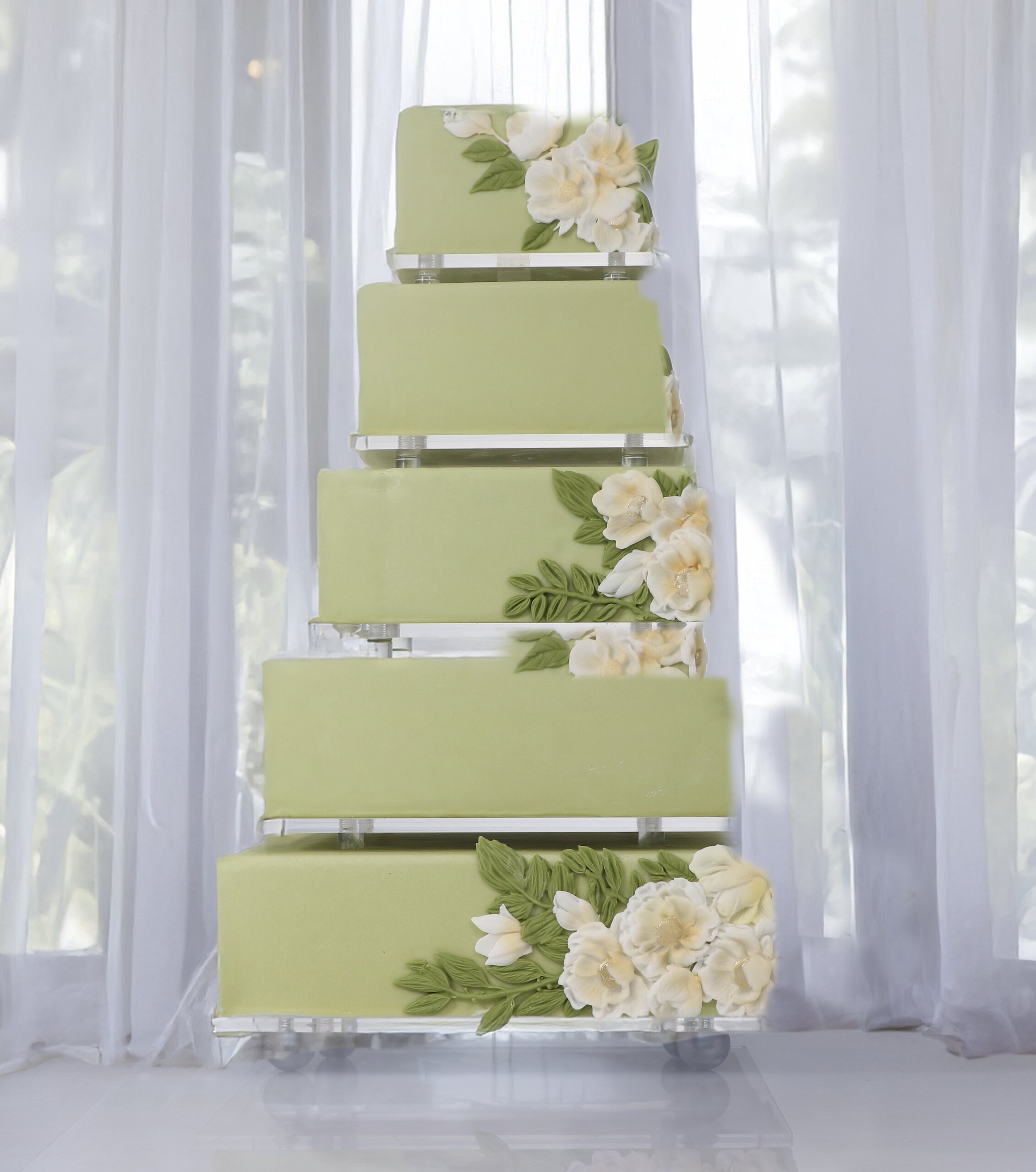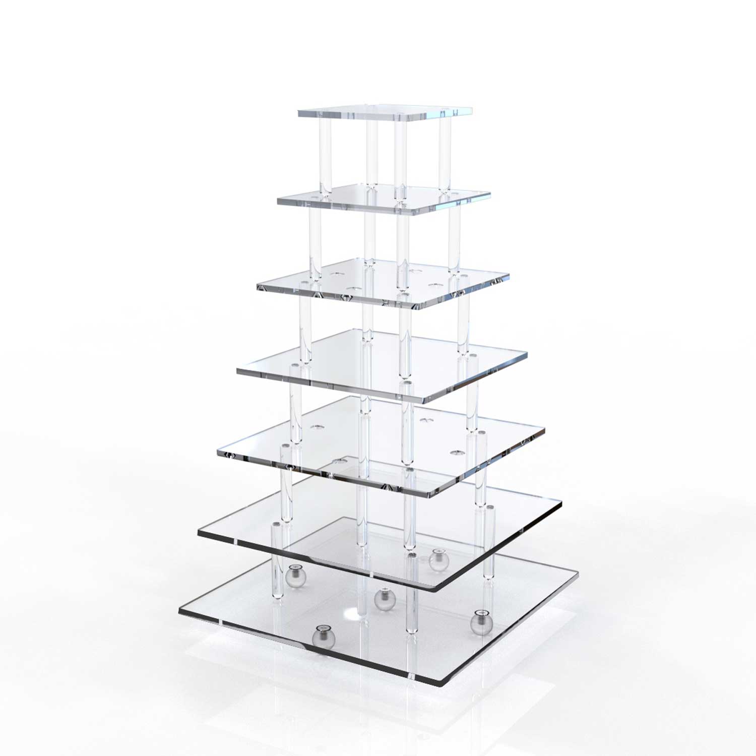 Quadratische Tortenetagere für große Kuchen, vollständig aus Plexiglas gefertigt und in 3, 5 oder 7 Ebenen konfigurierbar, um unterschiedlichen Präsentationsanforderungen gerecht zu werden.