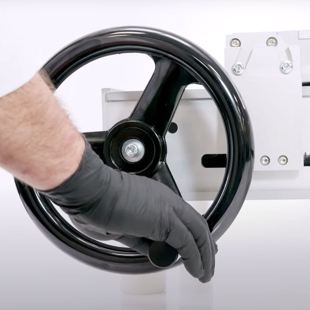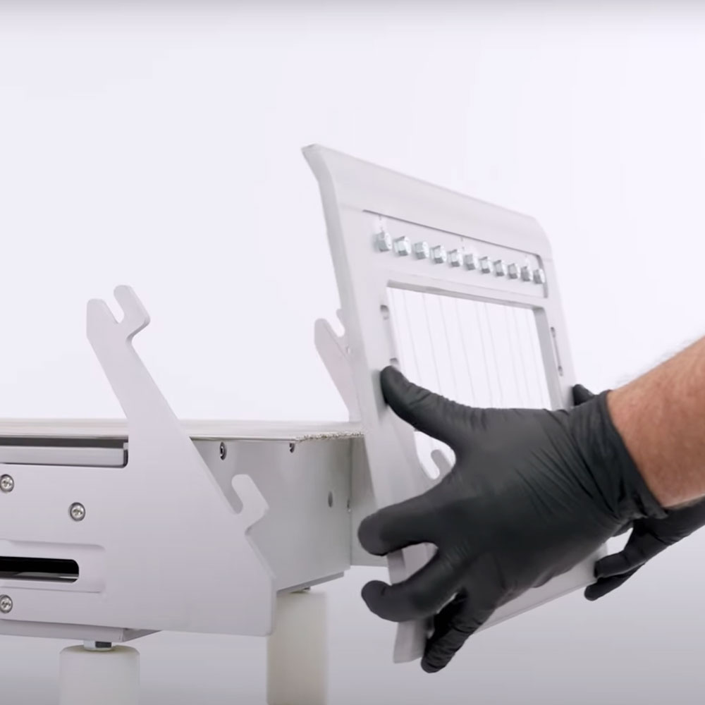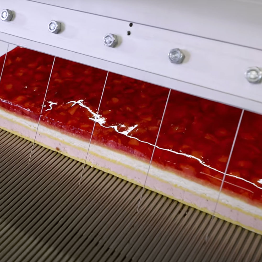Der Vorschub des Tisches erfolgt manuell über ein Handrad, das vom Bediener betätigt wird, der die Schnittgeschwindigkeit steuern kann. Der kurze Draht garantiert eine höhere mechanische Festigkeit und ermöglicht somit das portionsgenaue Schneiden auch sehr harter oder gefrorener Teige. Dieses Gerät ist leicht zu reinigen und erfordert keine Wartung.