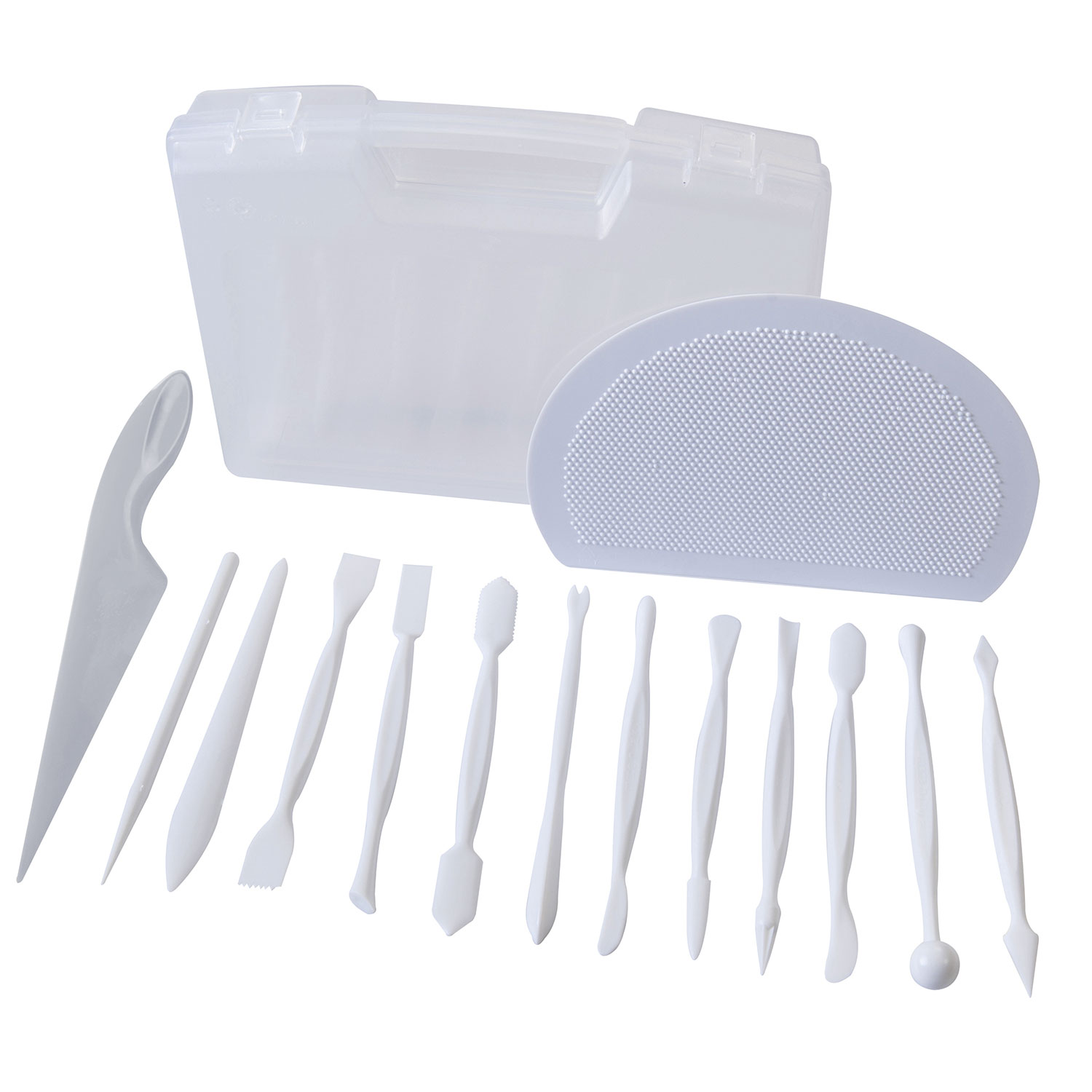 Set zum Dekorieren und Verarbeiten von Zuckerpaste, bestehend aus 12 verschiedenen doppelspitzigen Werkzeugen, 1 Messer und 1 Spachtel.