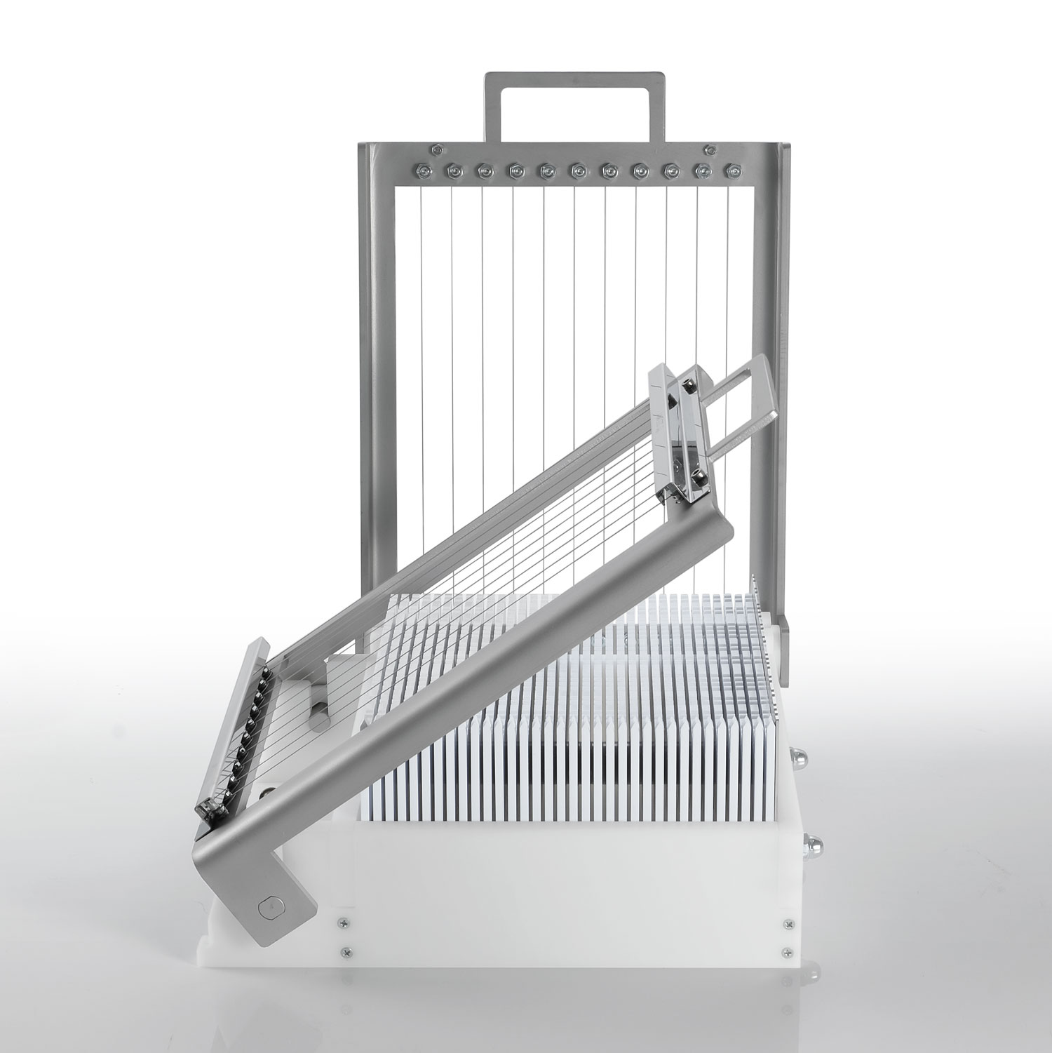 Doppelte Minigitarre mit 22-mm-Rahmen aus der Easy Guitar Cutter-Linie, bestehend aus einem ABS-Schneidetisch, einem Polyethylen-Sockel und zwei Rahmen (im Lieferumfang enthalten), die vollständig aus Edelstahl für regelmäßige 22-mm-Schnitte gefertigt sind.