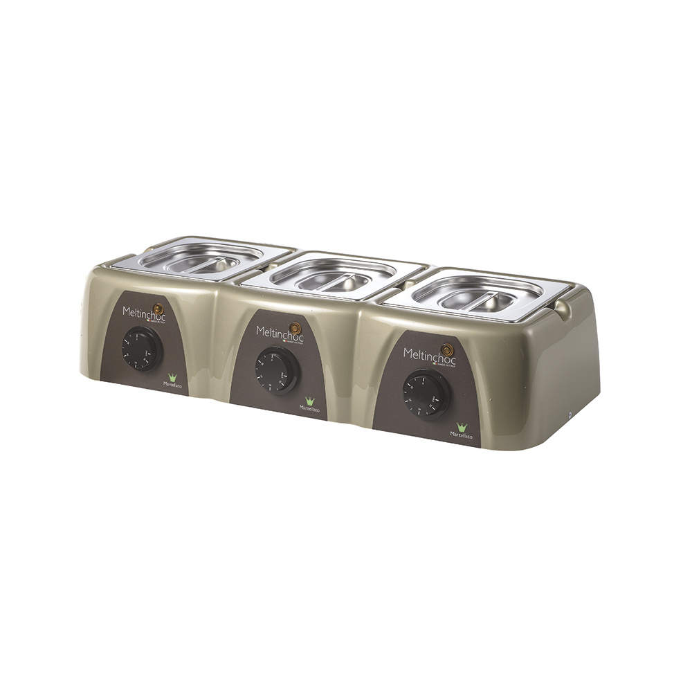 Der analoge Schokoladenschmelzer Meltinchoc mit Dreifachtank ist eines der unverzichtbaren Werkzeuge für die Verarbeitung von Schokolade. Präzision, Design, Einfachheit und geringe Größe sind die Hauptvorteile dieses Thekengeräts, das auch die anspruchsvollsten Konditoren zufriedenstellen kann. Der analoge Trockenschmelzer Meltinchoc ist mit 3 praktischen abnehmbaren Edelstahltanks zu je 1,5 Litern mit Kunststoffkörper und Deckel ausgestattet. Mit dem manuellen Thermostat können Sie die Schokolade auf die gewünschte Temperatur einstellen und halten. Tankinhalt: 1,5x3 | 3,5 Liter Größe Einzeltank: 14x15,5x10cm