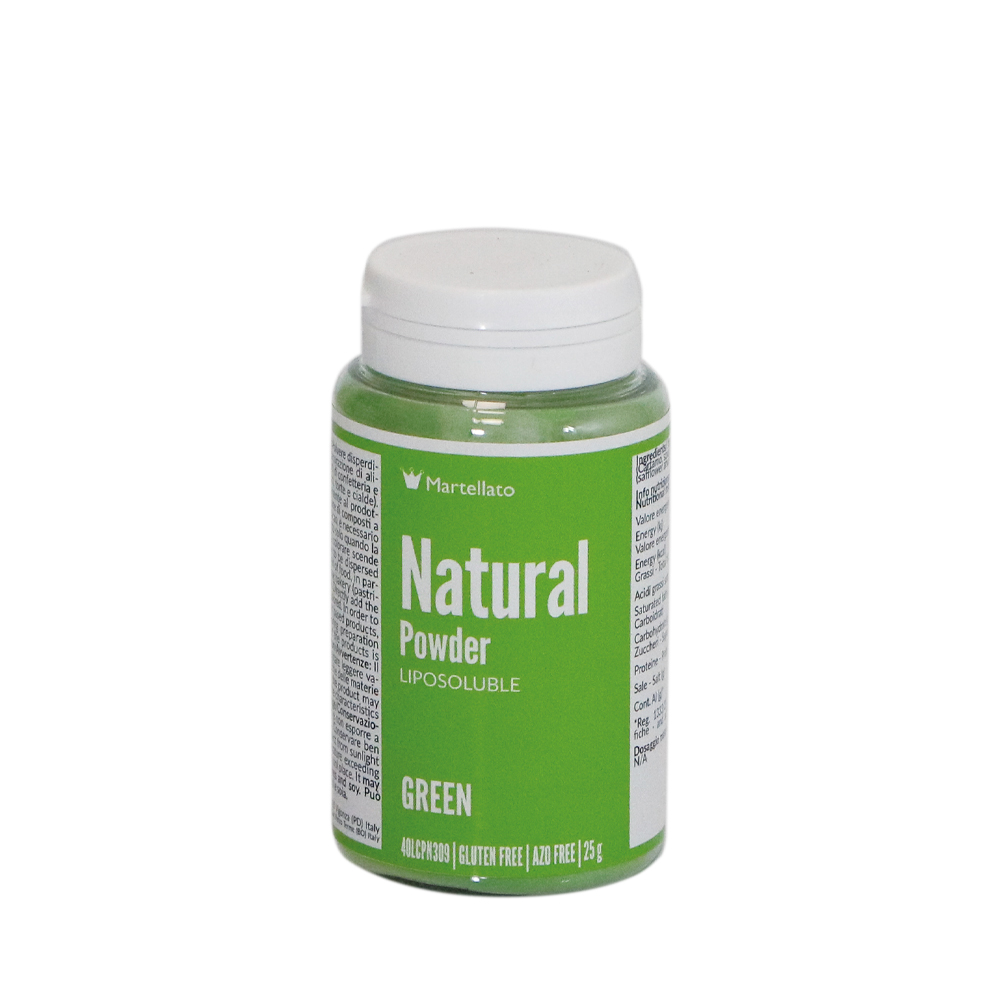 Natürlicher grüner, fettlöslicher, pulverförmiger Lebensmittelfarbstoff, geeignet zum Färben von Produkten auf Fettbasis wie Schokolade, Buttercreme, Mandelpaste, Zuckerpaste und Parfaits.
