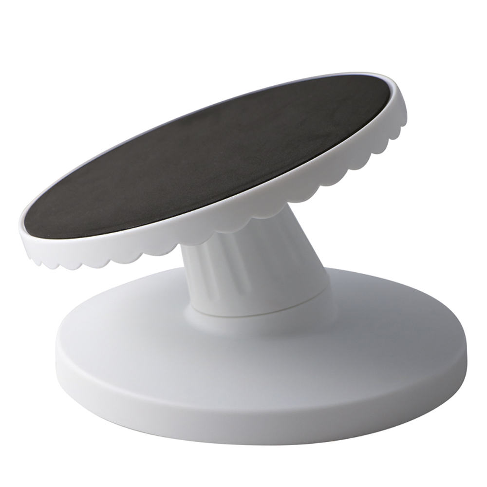 Kuchenplatte (drehbar) neigbar bis 20° mit rutschfester Matte, um Torten mit unterschiedlichem Gewicht in Position zu halten. Garantiert die Stabilität des Kuchens auch in einer schrägen Position.