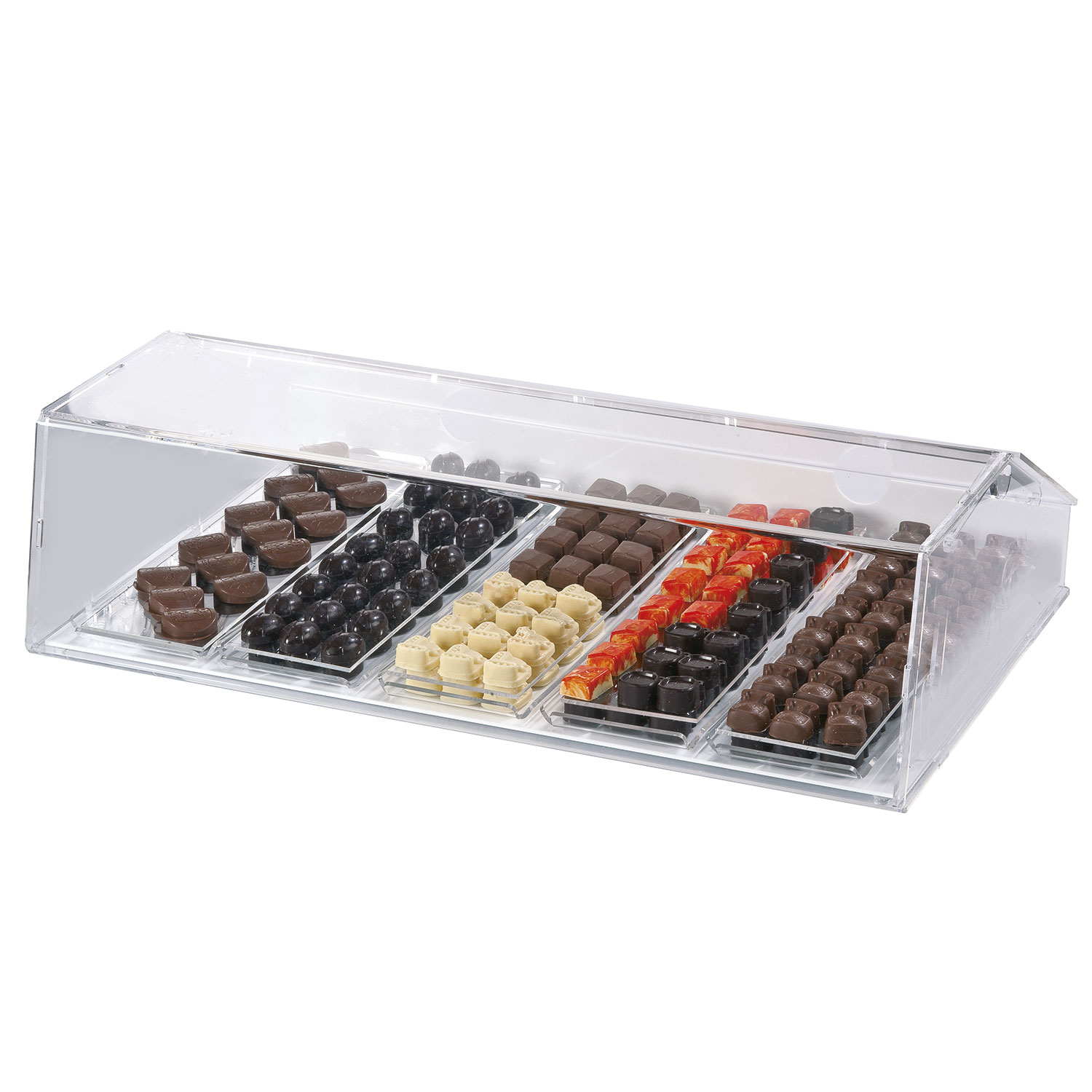Niedrige Plexiglasvitrine mit einer Tür. Internes Zubehör ist nicht enthalten. Ideal für besondere Aufbewahrungssituationen, z. B. in Bars, Restaurants, Hotels, Bäckereien usw.