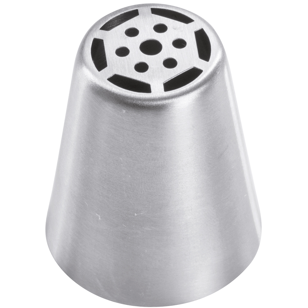 Tülle aus rostfreiem Stahl für Beutel mit floralem Muster. Diese Tülle ist nahtlos und garantiert einen gleichmäßigen Produktaustritt und hohe Festigkeit.